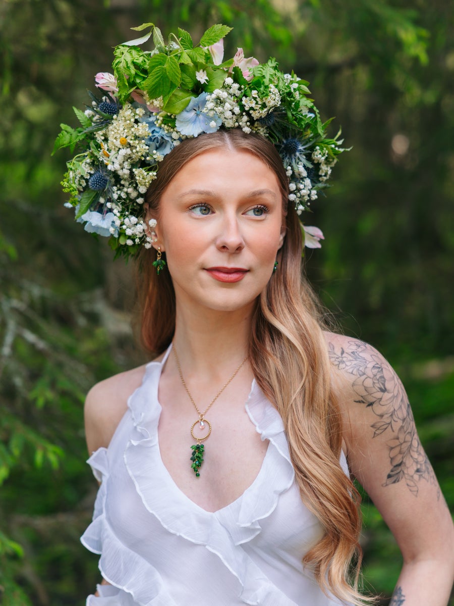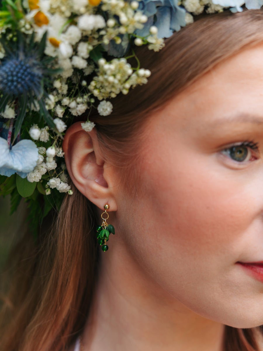 Käsin tehty. Polymeerimassa ja lasihelmet. Metalliosat ovat allergiaystävällistä kirurginterästä (nikkelitön) tai allergiaystävällistä 18K kullattua kirurginterästä (nikkelitön). Kaikki osat kestävät vettä.
