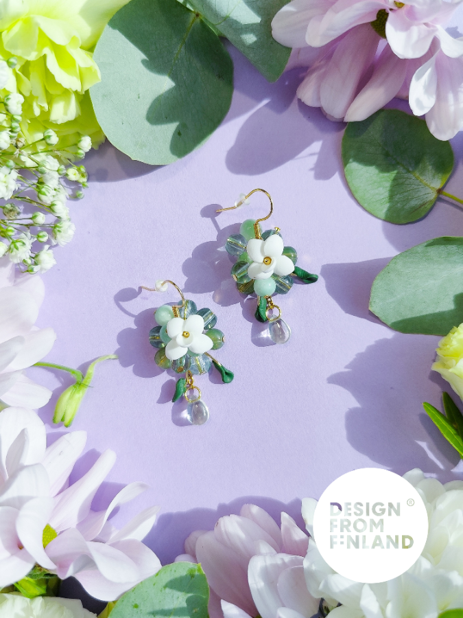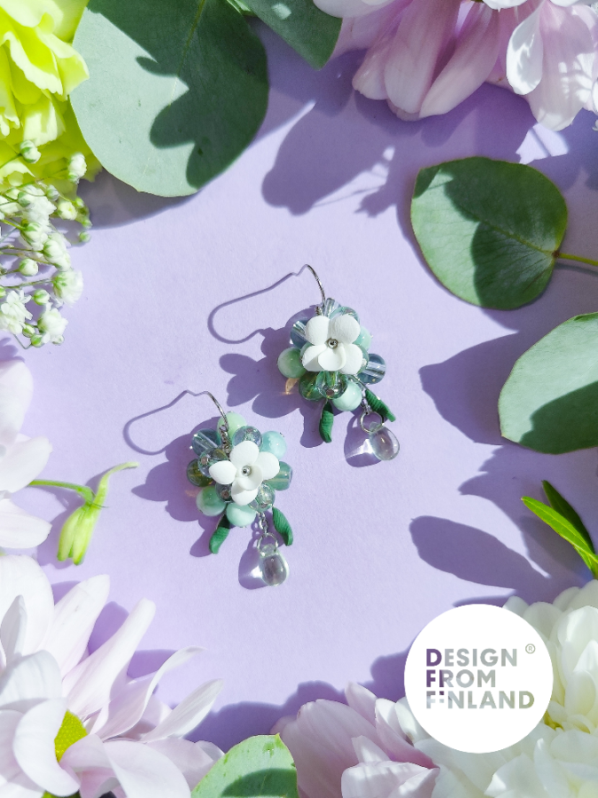 Käsin tehty. Polymeerimassa ja lasihelmet. Metalliosat ovat allergiaystävällistä kirurginterästä (nikkelitön) tai allergiaystävällistä 18K kullattua kirurginterästä (nikkelitön). Kaikki osat kestävät vettä.