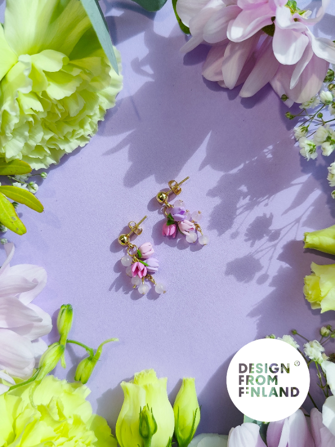 Käsin tehty. Polymeerimassa ja lasihelmet. Metalliosat ovat allergiaystävällistä kirurginterästä (nikkelitön) tai allergiaystävällistä 18K kullattua kirurginterästä (nikkelitön). Kaikki osat kestävät vettä.
