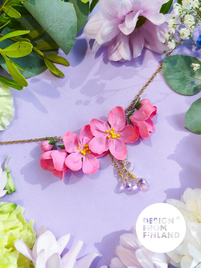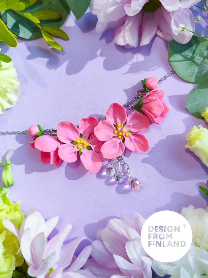 Käsin tehty. Polymeerimassa ja lasihelmet. Metalliosat ovat allergiaystävällistä kirurginterästä (nikkelitön) tai allergiaystävällistä 18K kullattua kirurginterästä (nikkelitön). Kaikki osat kestävät vettä.