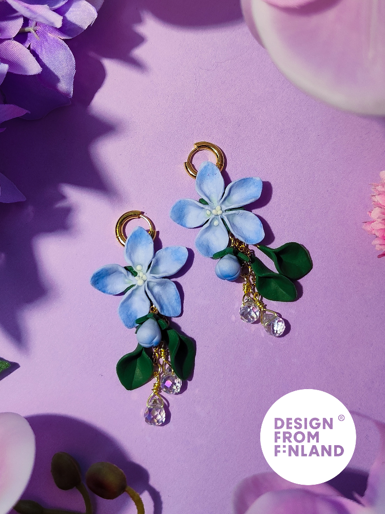 Käsin tehty. Polymeerimassa ja lasihelmet. Metalliosat ovat allergiaystävällistä kirurginterästä (nikkelitön) tai allergiaystävällistä 18K kullattua kirurginterästä (nikkelitön). Kaikki osat kestävät vettä.
