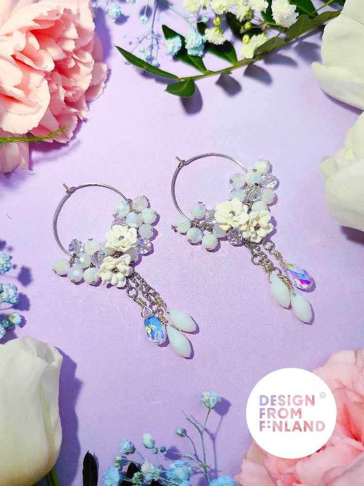 Polymeerimassa ja lasihelmet. Metalliosat ovat allergiaystävällistä kirurginterästä (nikkelitön) tai allergiaystävällistä 18K kullattua kirurginterästä (nikkelitön). Kaikki osat kestävät vettä.