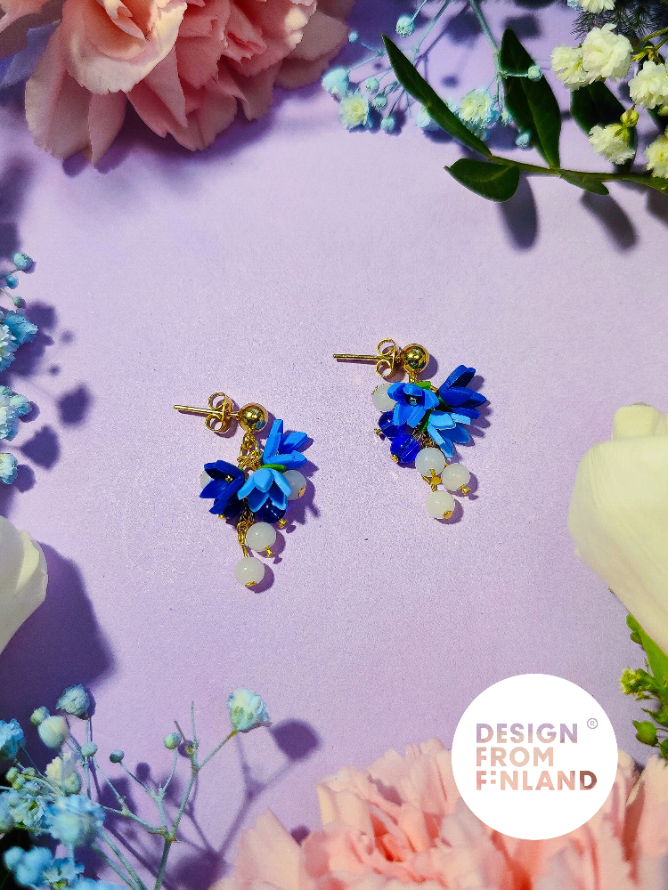 Käsin tehty. Polymeerimassa ja lasihelmet. Metalliosat ovat allergiaystävällistä kirurginterästä (nikkelitön) tai allergiaystävällistä 18K kullattua kirurginterästä (nikkelitön). Kaikki osat kestävät vettä.